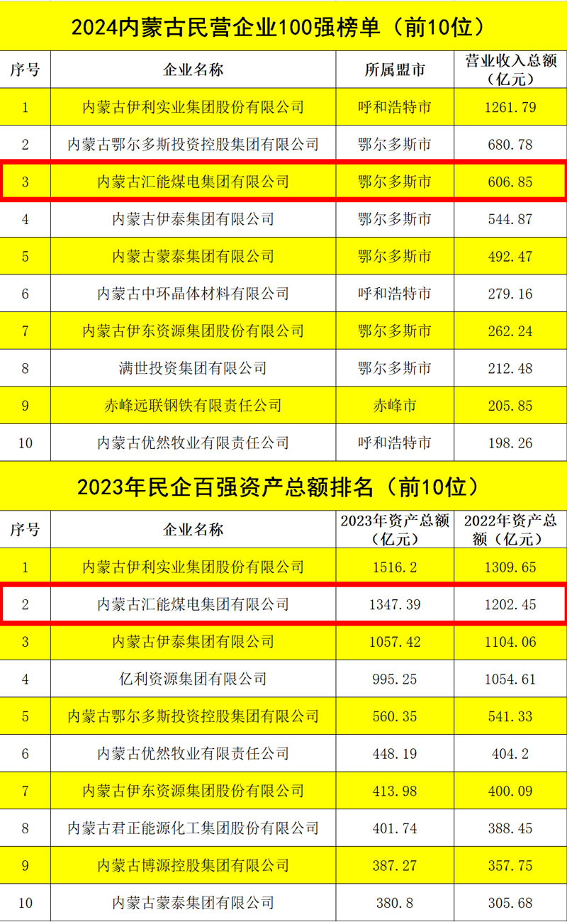 6月25日,2024內(nèi)蒙古民營企業(yè)100強(qiáng)發(fā)布會暨內(nèi)蒙古自治區(qū)促進(jìn)“兩個(gè)健康”現(xiàn)場會在內(nèi)蒙古鄂爾多斯市舉行。會上公布了2024內(nèi)蒙古民營企業(yè)100強(qiáng)系列榜單,匯能集團(tuán)以606.85億元營收總額榮列百強(qiáng)榜單第三位,較上年增長110.41億元,上升一位;資產(chǎn)總額1347.39億元,較去年增長144.94億元,仍位列民企百強(qiáng)第二位;納稅額130.1億元,位列民企百強(qiáng)第一位,較上年增長10.2億元,上升一位;吸納就業(yè)人數(shù)10236人,位列民企百強(qiáng)第五位,較上年增加1883人,上升兩位。